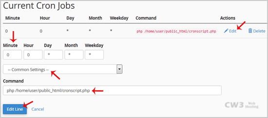 3. Scroll down to the end of the page, and under Current Cron Jobs, locate your cronjob and click on the Edit button.