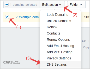 4. Check the box next to your domain name(s) and click on the DNS Settings from the Bulk action drop-down menu.