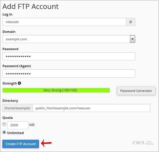 - Password: (Enter new FTP Password or generate a new password by clicking on the Password Generator button)