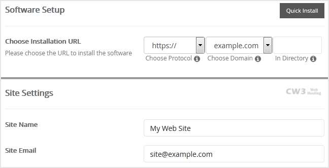 - Choose Installation URL: Choose the appropriate protocol/domain. Inside the "In Directory" field, should you want to install this in a directory, i.e. example.com/directory, enter the directory name. Otherwise, leave it blank to install in your main domain, i.e. example.com