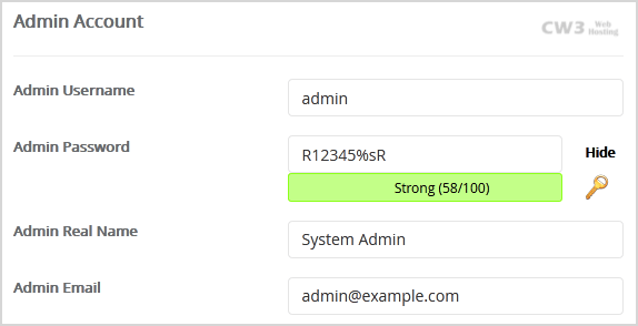 - Admin Username: Your new Contao username (for security reason do not use the Administrator or the Admin username.)