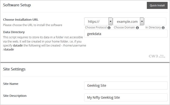 • Admin Username: Your new Geeklog username (for security reason do not use the Administrator or the Admin username.)