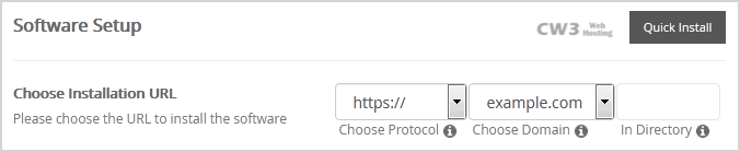 • Choose Installation URL: Choose the appropriate protocol/domain. Inside the "In Directory" field, should you want to install this in a directory, i.e., example.com/directory, enter the directory name. Otherwise, leave it blank to install in your main domain, i.e., example.com