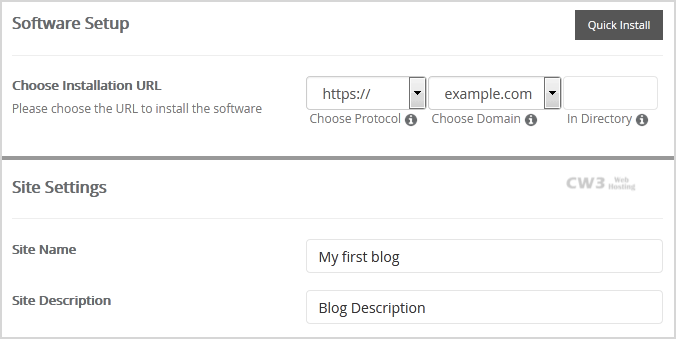 • Choose Installation URL: Choose the appropriate protocol/domain. Inside the "In Directory" field, should you want to install this in a directory, i.e., example.com/directory, enter the directory name. Otherwise, leave it blank to install in your main domain, i.e., example.com