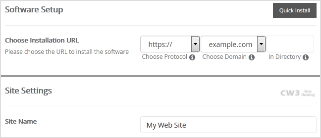 • Choose Installation URL: Choose the appropriate protocol/domain. Inside the "In Directory" field, should you want to install this in a directory, i.e., example.com/directory, enter the directory name. Otherwise, leave it blank to install in your main domain, i.e., example.com